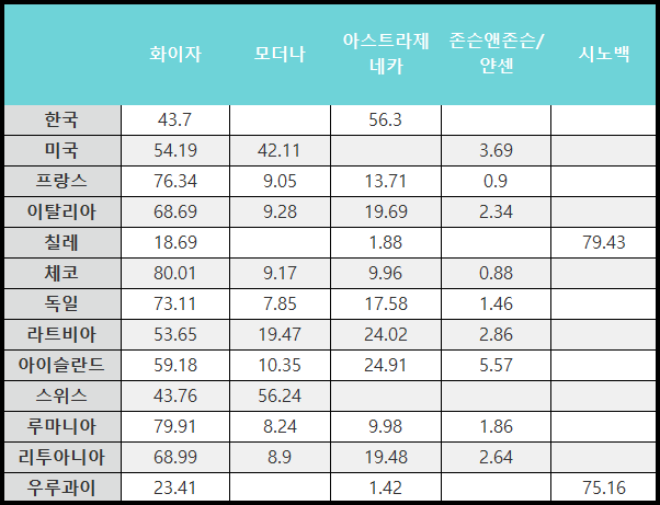 아래 표는 백신 별 누적 접종자를 전체 백신 접종자로 나눈 값으로 계산한 비율입니다. 우리나라는 코로나19 예방접종 대응 추진단에서 제공한 6월 6일 자료이며, 국내에서 투여된 백신의 비율은 화이자가 43.7%, 아스트라제네카가 56.3%입니다.
