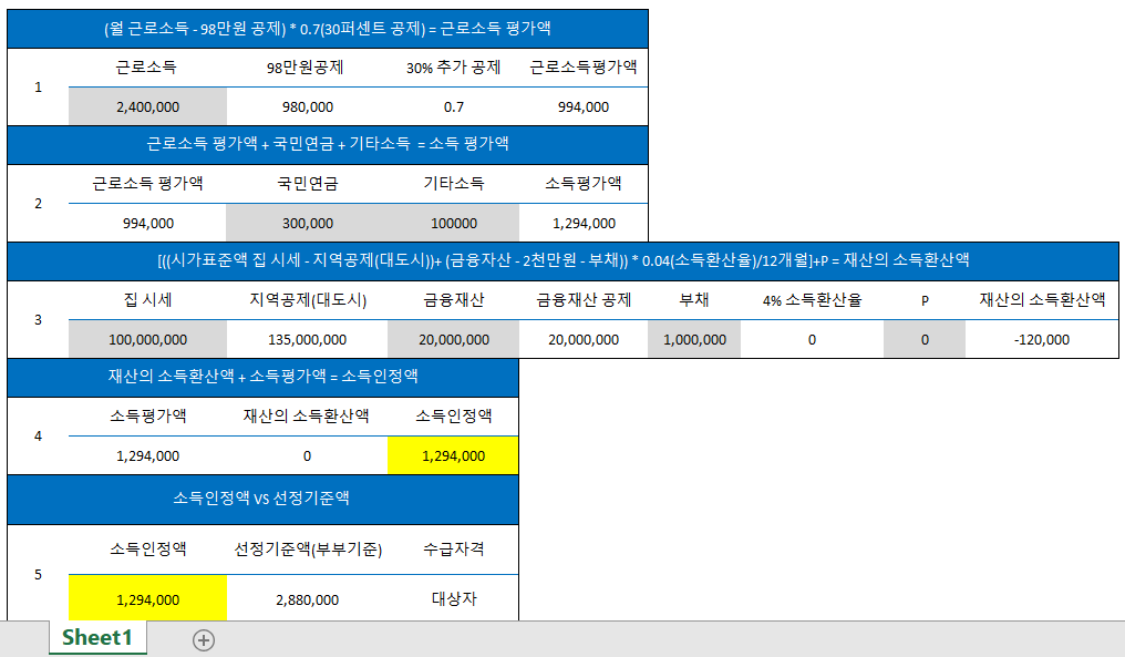 소득과 재산의 합이 소득인정액인데요. 소득인정액이 선정기준액보다 작으면 기초연금을 수령할 수 있는 것입니다. 제가 부모님 대신 홈페이지에서 해본 자가진단 결과는 수급대상이라고 나옵니다. 아래는 제가 소득인정액 산출공식을 엑셀로 만들어서 계산해 본 것인데요. 회색 부분이 어떻게 달라지느냐에 따라서 부모님께서 만 65세가 되셨을 때 기초연금을 받을 수 있을지 달라질 것 같습니다. 재산 소득환산액은 마이너스이기 때문에 재산 소득은 0으로 계산돼서 집 값이 폭등 + 금융재산이 늘어난다 하더라도 기초연금은 받을 수 있을 것 같습니다.