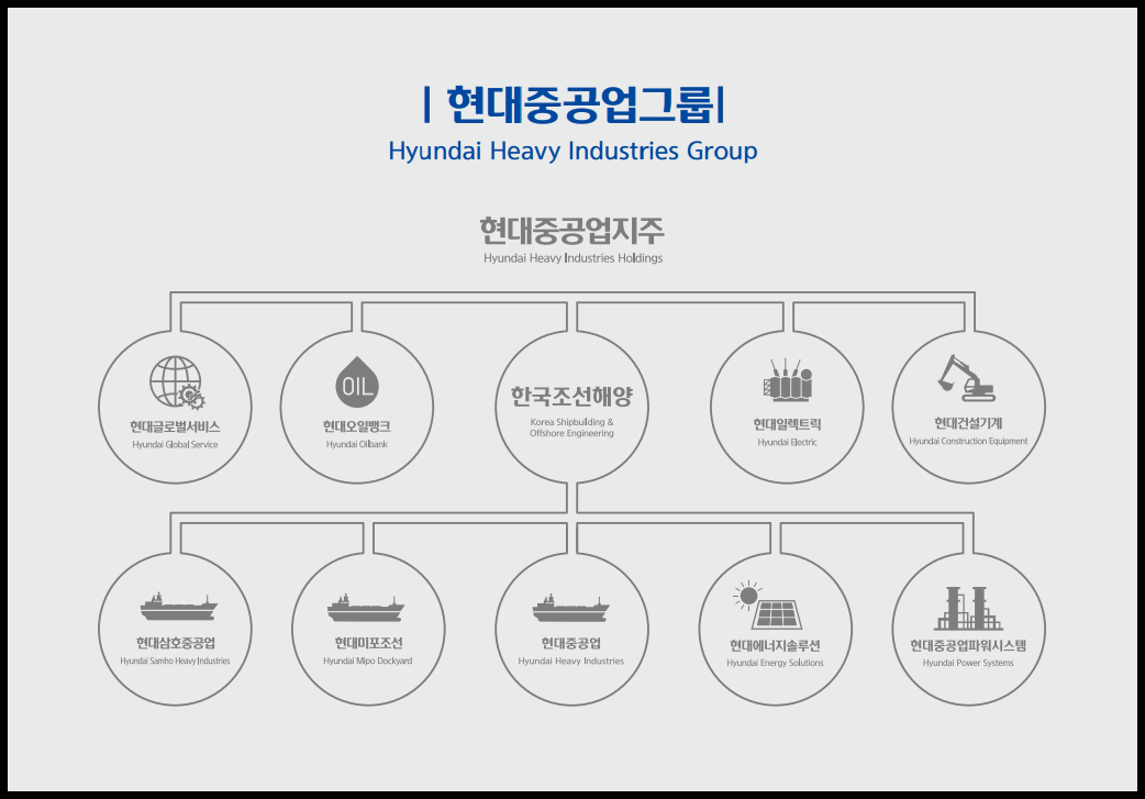 현대중공업지주와 현대중공업을 같은 기업이라고 헷갈렸는데, 현대중공업지주는 2017년 현대중공업에서 인적 분할되어 2017년에 8월에 출범한 회사로 현대중공업그룹의 지주회사입니다. 원래는 현대로보틱스라는 이름이었는데, 2018년 현대중공업지주로 사명을 변경했습니다. 아래 현대중공업그룹의 지배구조를 보면 알 수 있듯이 현대중공업그룹은 현대중공업지주를 중심으로 한국조선해양, 현대일렉트릭, 현대건설기계, 현대오일뱅크, 현대글로벌서비스를 지배하고, 한국조선해양이 현대중공업, 현대미포조선, 현대삼호중공업 등을 거느린 형태라고 할 수 있습니다.
