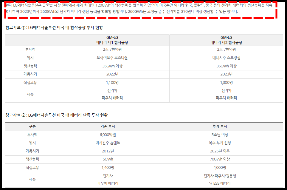 배터리 제조업체로서 배터리를 얼마나 차질 없이 잘 생산해 낼 수 있는 생산능력이 매우 중요한데요. 엘지에너지솔루션은 국내외로 4군데에 사업소가 있고, 최근에 미국 제너럴모터스와 함께 미국에 합작공장 2곳을 설립했고, 앞으로도 미국뿐 아니라 한국, 폴란드, 중국 등으로 배터리 생산능력을 지속적으로 확대하여 전기차 배터리 생산능력을 260 GWh로 확보할 방침이라고 합니다. 260 GWh는 고성능 순수 전기차를 370만 대 이상 생산할 수 있는 양이라고 합니다. 현재 엘지에너지솔루션은 글로벌 시장 전체에서 세계 최대인 120 GWh의 생산능력을 확보하고 있다네요.
