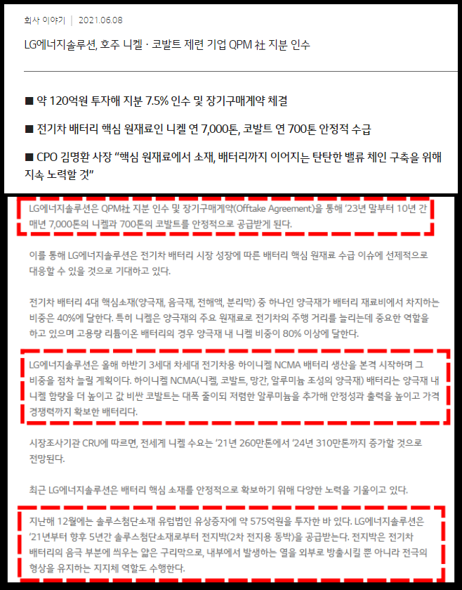 배터리를 만드는 원자재 또한 배터리 제조에 중요한 부분일텐데요. 엘지에너지솔루션은 120억 원을 투자하여 호주에서 니켈, 코발트 등을 생산하는 제련기업인 QPM의 지분 7.5%를 확보함으로써, 전기차 배터리의 핵심 원재료를 안정적으로 수급이 가능해질 것으로 보입니다. 2023년 말부터 10년간 매년 7천 톤의 니켈과 700톤의 코발트를 안정적으로 공급받게 된다고 하네요.