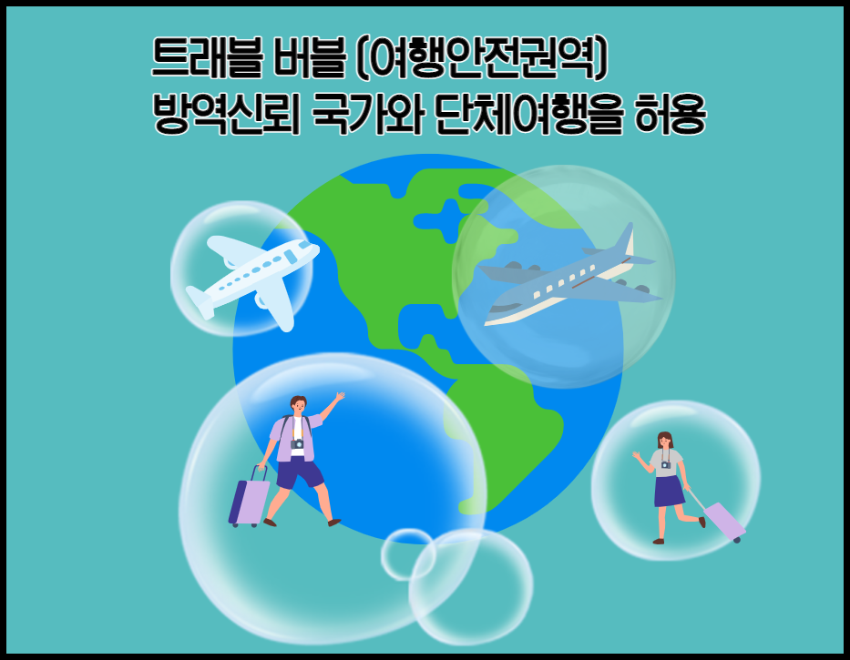 코로나 백신 접종을 완료한 사람에 한해 특정 국가에 대한 단체 여행이 7월부터 가능할 것 같습니다. 코로나 확산이 호전된 일부 국가들로 여행을 할 수 있도록 하는 제도를 마련 중인데요. 여행안전권역이라도 하고 트래블 버블이라고도 불리는 제도입니다. 안전한 버블 (방역 신뢰 국가) 안에서 여행한다는 의미인 것 같은데요. 어느 나라와 어떤 방법으로 해외여행을 할 수 있는지 정부 보도자료를 정리해보도록 하겠습니다.