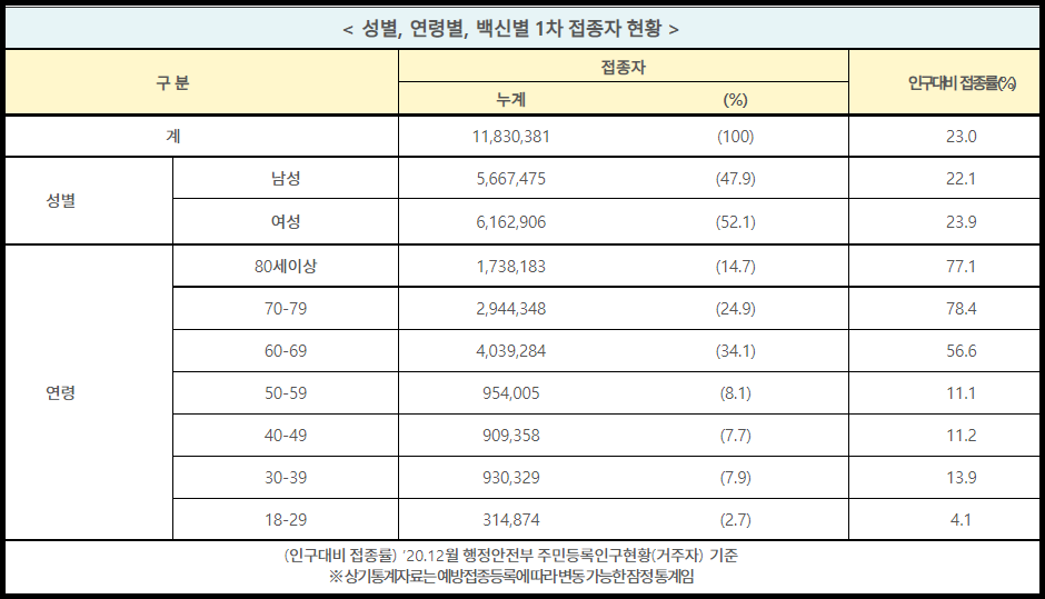 인구 대비 성별 백신 1차 접종률은 남성이 약 566만 명으로 22.1%이고, 여성은 약 616만 명으로 23.9%입니다.
