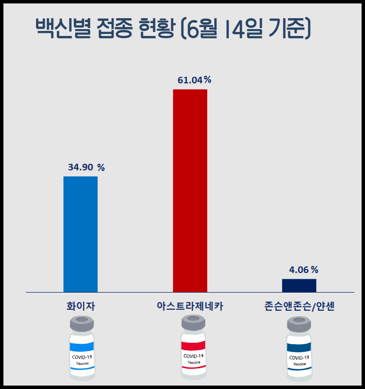 아래 백신별 접종현황 그래프는 6월 14일 기준 국내 백신별 누적 접종 횟수를 코로나 백신 총 누적 접종 횟수로 나누어 계산한 자료입니다. 백신 별 접종률로는 아스트라제네카가 61.04%로 가장 많이 접종되었고, 그다음으로 화이자가 34.9%이고, 얀센은 4.06%입니다.