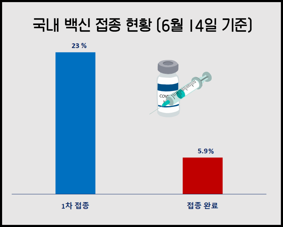 코로나 19 예방접종 대응 추진단에 따르면 6월 14일 0시 기준으로 코로나19 예방접종을 1회 이상 실시한 사람이 약 1,183만 명으로 전 국민의 23%에 해당한다고 발표했습니다. 이 중 2차까지 접종한 접종 완료자(얀센 백신 1회 접종자 포함)는 3,004,029명으로, 전 국민의 5.9%라고 합니다.