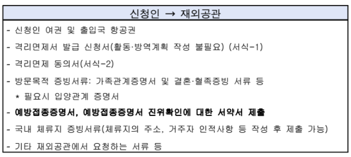 재외공관에 격리면제서를 신청할 때 가족관계증명서류를 제출해야합니다. 이때 국적과 상관없이 출생증명서, 결혼증명서, 사망증명서 등을 결합해서 직계가족임을 입증할 수 있으면 된다고 합니다. 만약, 오랜전 이민으로 한국 가족관계를 증명할 수 없다면 한국에 거주하는 가족의 가족관계등록부와 면제 신청자의 제적부 또는 폐쇄된 가족관계등록부를 결함하면 직계가족임을 입증할 수 있다고 합니다. 또한 격리면제서를 발급받은 부모와 6세 미만 아동은 예방접종증명서가 없더라도 격리면제서 발급이 가능합니다.