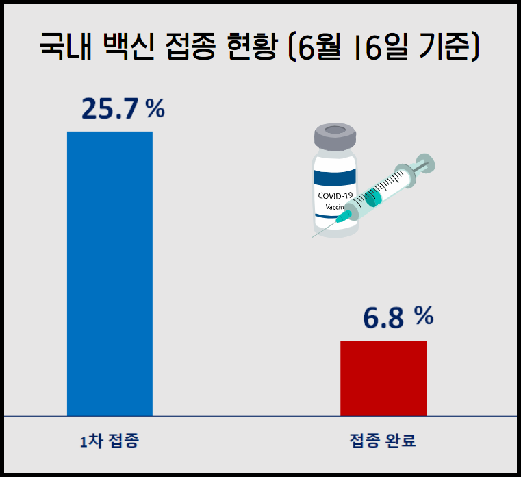 코로나 19 예방접종 대응 추진단에 따르면 6월 16일 0시 기준으로 코로나19 예방접종을 1회 이상 실시한 사람이 약 1,322만 명으로 전 국민의 25.7%에 해당한다고 발표했습니다. 이 중 2차까지 접종한 접종 완료자(얀센 백신 1회 접종자 포함)는 3,472,376명으로, 전 국민의 6.8%라고 합니다.