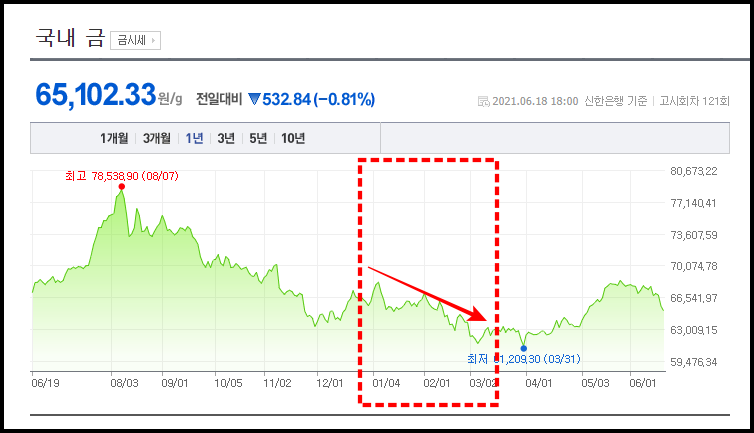 네이버 금융에서 2021년 1월부터 3월 동안 금 값을 확인해보니, 미국국채와 원달러가 오른 기간 동안 금 값은 하락했습니다.