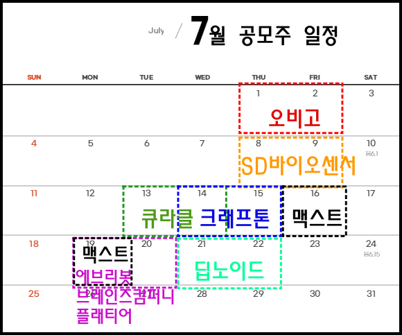 2021년 7월 공모주 일정 | 오비고, SD바이오센서, 큐라클, 크래프톤, 맥스트, 에브리봇, 브레인즈컴퍼니, 플래티어, 딥노이드