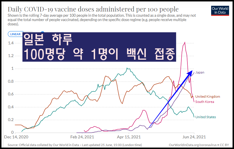 아래 그래프는 일일 100명당 몇 명이 백신을 접종하는 지를 보여주는데요. 5월부터 일본과 우리나라의 기울기가 가파른게 오르고 있습니다. 반대로 이미 접종을 많이 한 미국과 영국은 기울기가 줄어들고 있습니다.