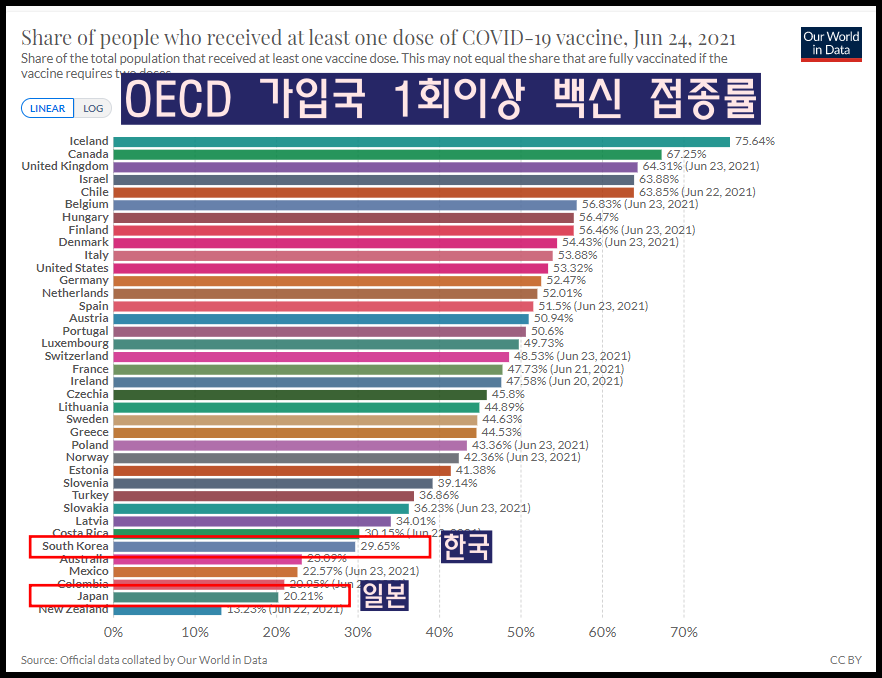 OECD 회원국의 평균 백신 접종률(1회 이상)은 약 44%입니다. 일본은 OECD 회원국 38개국 중 37위(한국 33위)이며, 전세계적으로는 91위(한국 71위)입니다 (1회 이상 백신 접종 기준).