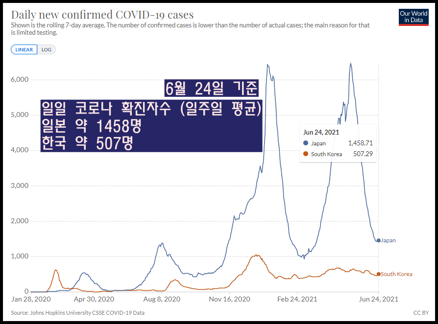 6월 24일 기준 일주일 평균으로 계산한 일일 코로나 확진자수를 살펴보니 일본은 약 1,458명이고, 한국은 약 507명입니다. 일본의 일일 코로나 확진자수는 5월 6,400여명인 것에 비해 많이 줄어들었지만, 도쿄올림픽 D-27인 상황에서 일일 확진자 수 천 명대는 여전히 높은 거 아닌가 싶습니다.