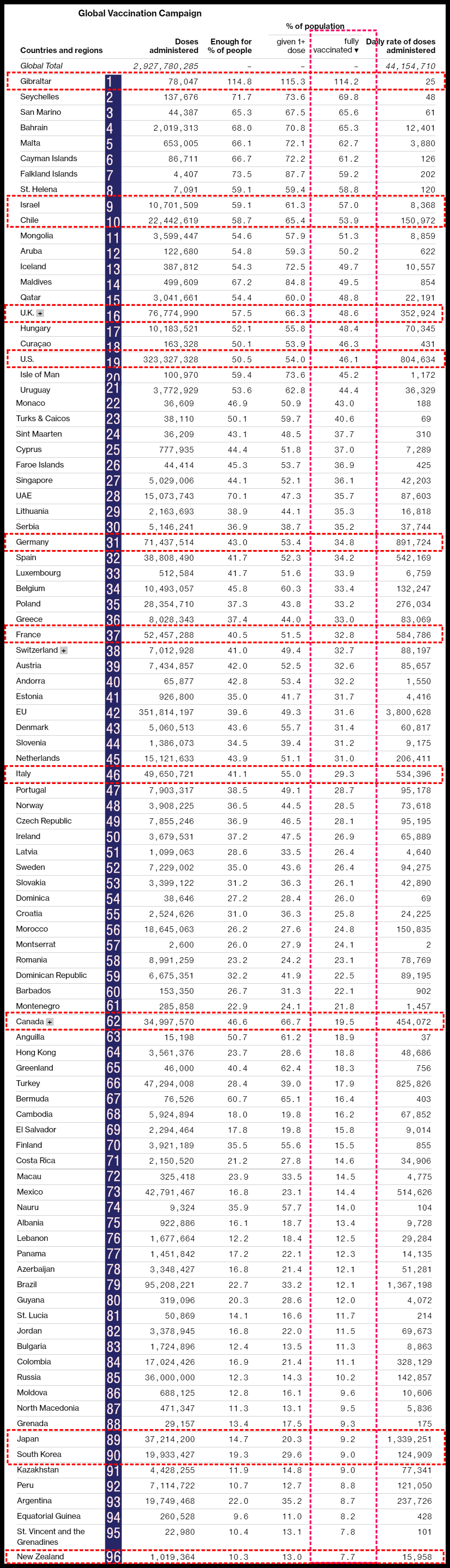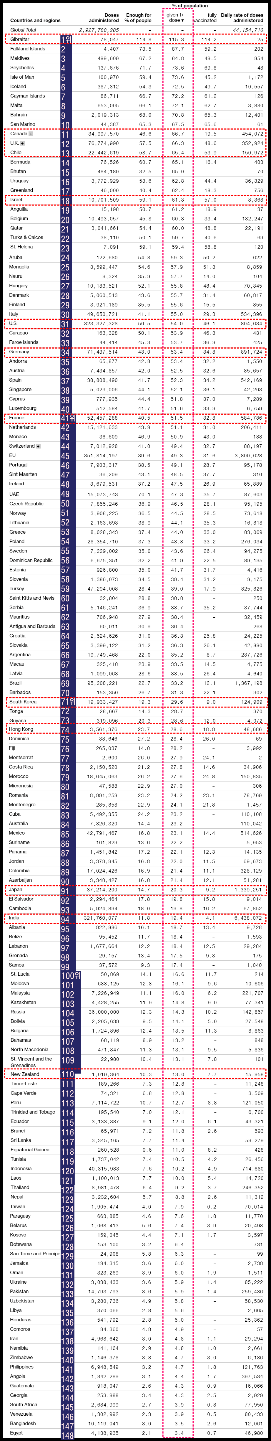 블룸버그에서 가져온 자료를 토대로 전 세계 백신 접종 순위(인구 대비 1회 이상 접종률)를 매겨보면 아래 그림과 같습니다. 한국은 1회 이상 접종률이 29.6%로 71위입니다. 주요 국가들을 살펴보면 지브롤터가 1위(115%), 캐나다는 11위(66.7%), 영국이 12위(66.3%), 칠레가 13위(65.4%), 이스라엘 18위 (61.3%), 미국 31위(54%), 독일 34위(53.4%), 프랑스 41위(51.5%), 한국 71위(29.6%), 홍콩 74위(28.6%), 일본이 91위(20.3%), 인도 94위(19.4%), 뉴질랜드 110위(13%)입니다. 나머지 국가들은 아래 표를 참고해주세요.
