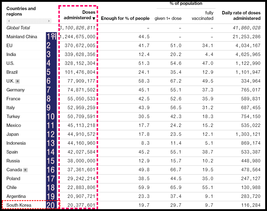 백신 누적 접종 횟수로 순위를 매겨 20위까지 가져왔습니다. 우리나라는 20,377,601회로 20위입니다. 몇 개 국가를 살펴보면, 1위는 중국 (약 12억 4천만 회), 3위 인도 (약 3.39억만회), 6위 영국 (약 7천7백만회), 12위 일본 (약 4천4백만회), 16위 캐나다 (약 3천7백만회), 18위 칠레 (약 2천2백만회)입니다. 나머지 국가들은 아래 표를 참고해주세요.