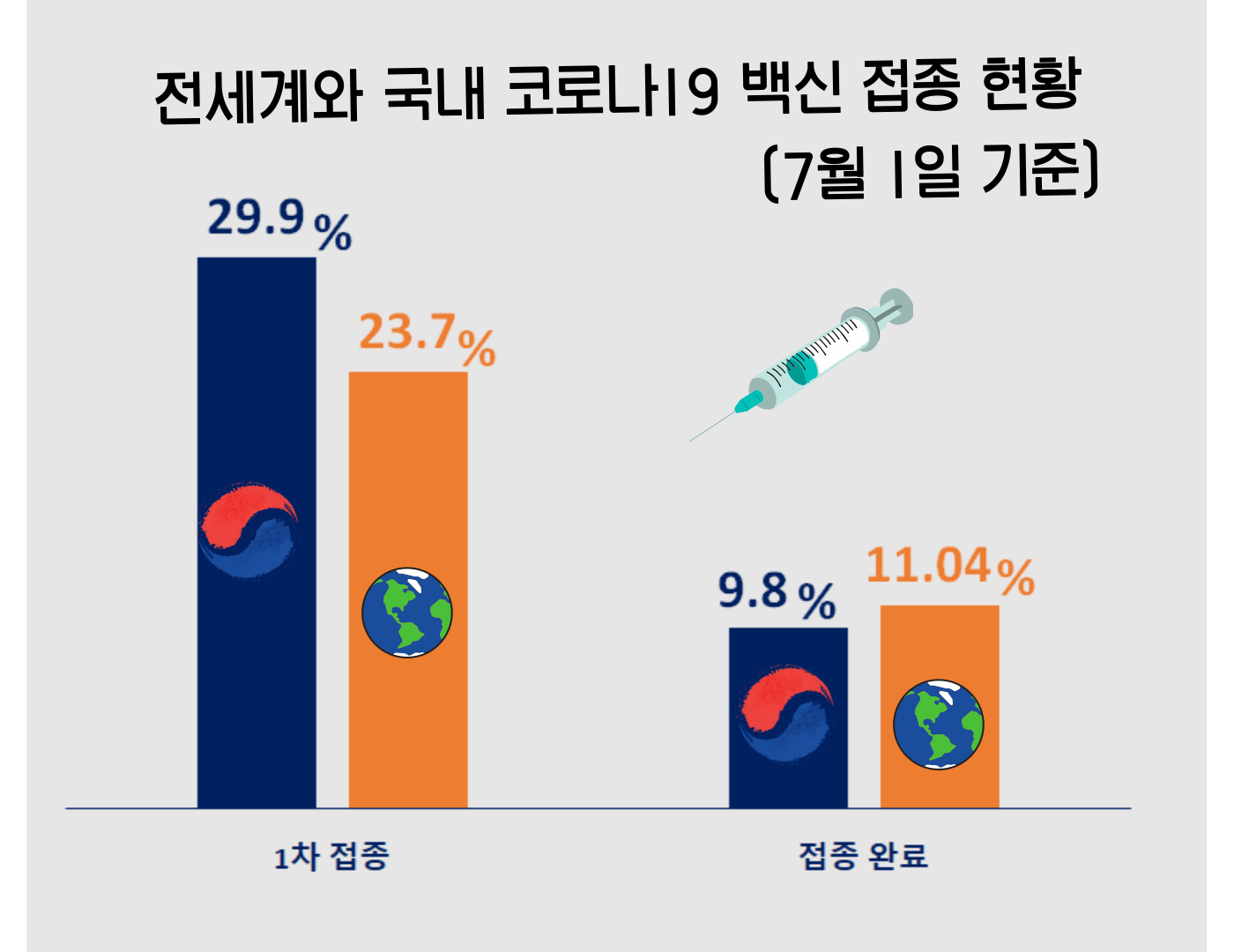 7월 1일 기준 전 세계 인구의 23.7%가 코로나 백신을 1회 이상 맞았고, 접종을 완료한 전 세계 인구비율은 11.04%입니다. 전 세계적으로 31억 3천만 회가 투여되었으며, 현재 매일 4,007만 회가 투여되고 있다고 합니다. 저소득 국가의 사람들은 단 1%만이 최소 1회 접종을 받았다고 합니다.