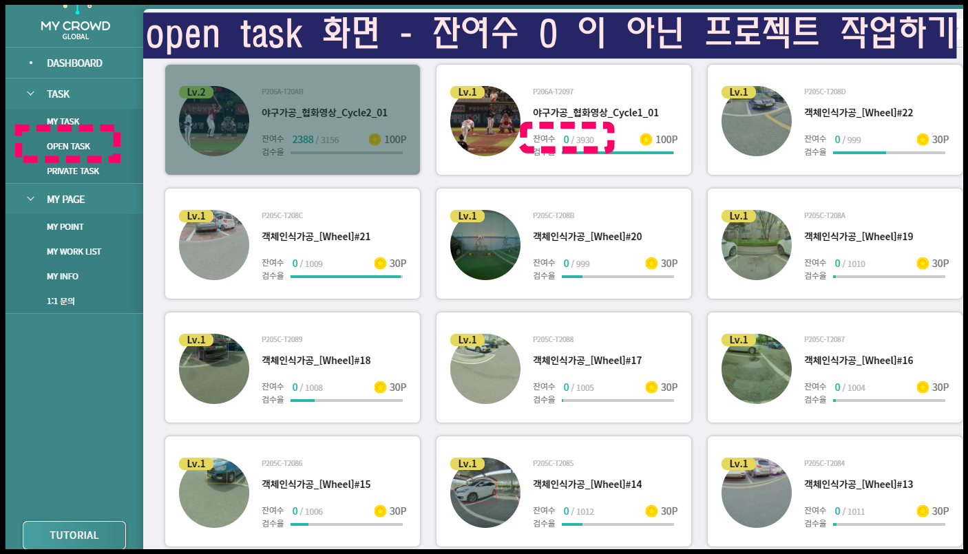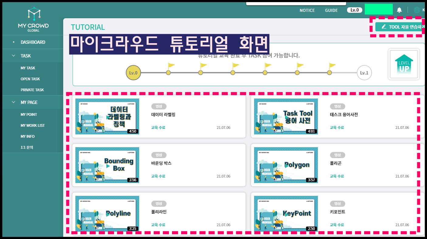 2. 회원가입시 '레벨 0'으로 시작하여 튜토리얼을 전부 마쳐야 레벨 1이 되고 500점의 점수가 주어지며, 그때부터 작업에 참여할 수 있습니다. 아래 이미지는 마이크라우드 튜토리얼 화면입니다.