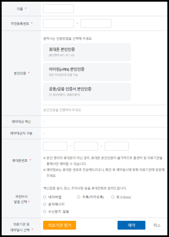 4. 대리예약과 본인예약 모두 예약을 진행하는 사람의 본인인증이 필요합니다. 네이버, 카톡, 토스, 문자 메시지 중 자주 상요하는 것을 하나 선택하면 그곳으로 백신 접종 날짜, 장소, 주의사항 등을 알려줍니다. 의료기관 찾기를 눌러 원하는 동네 병원 또는 의원을 찾아서 예약을 완료하면 됩니다.