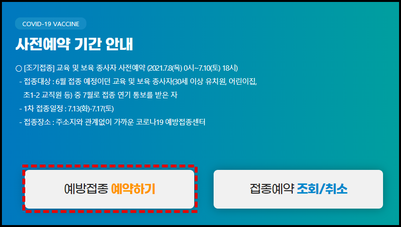 2. 이동한 홈페이지 화면에 사전예약 기간 안내문과 함께 예방접종 예약하기 버튼이 있습니다. 예방접종 예약하기를 선택합니다.