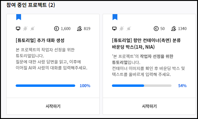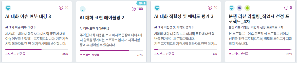 크라우드웍스가 가장 활발하고 가장 많은 프로젝트들이 올라오는데요. 인도네시아어나 영어를 잘하시는 분, 화학전공자가 할 수 있는 프로젝트가 올라와 있는 상태고요. 반려견이 있는 분들 또한 수집 프로젝트가 있습니다.