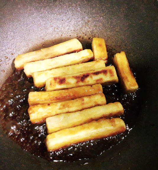 튀긴 두부는 기름기를 살짝 제거해주고, 간장, 설탕, 굴소스, 물을 같은 양으로 넣고 바글바글 끓인 다음에 튀긴 두부를 넣고 소스를 잘 입혀줍니다. 소스는 기호에 맞게 조절해주시면 돼요.
