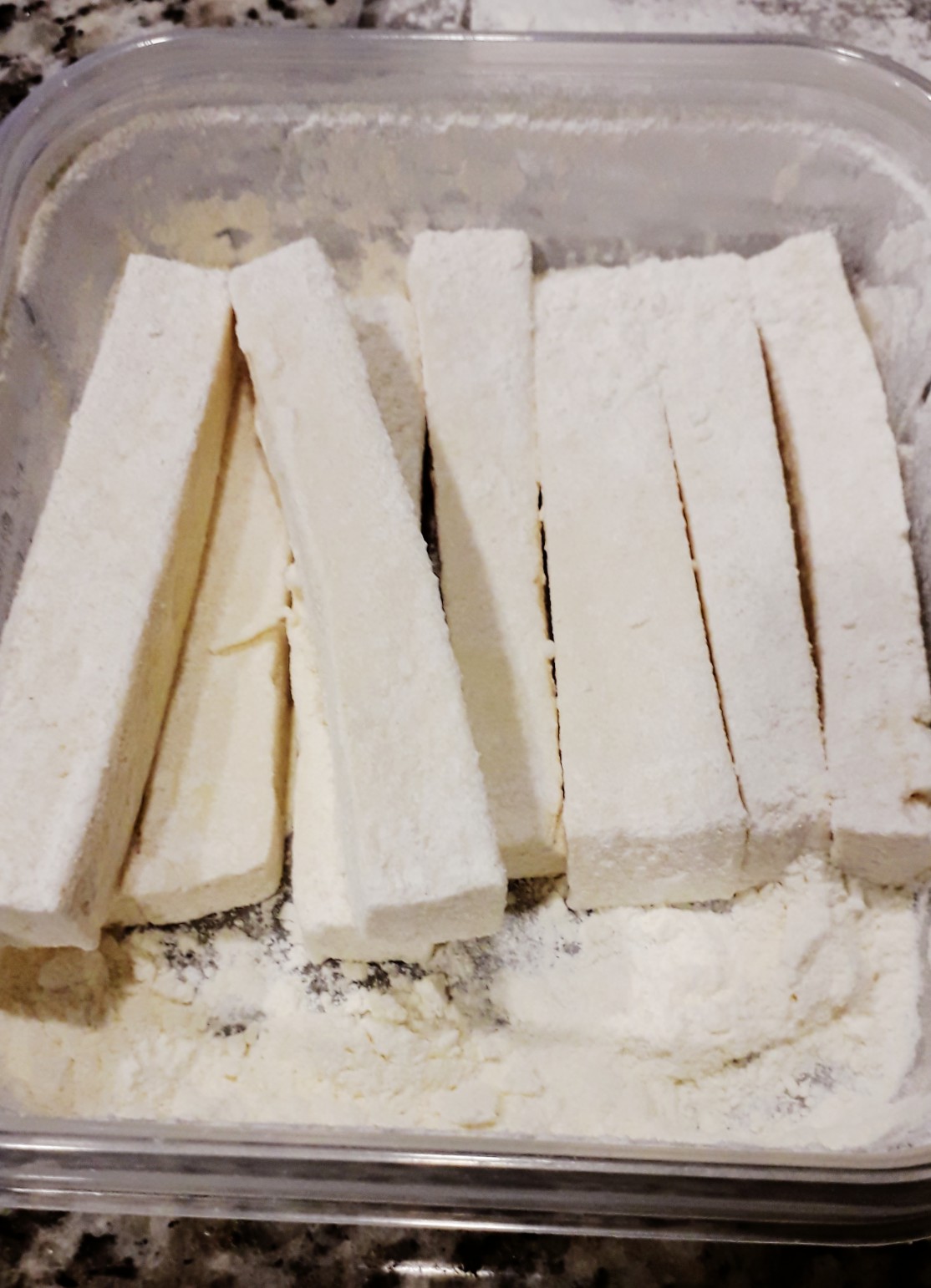 만드는 방법은 정말 간단해요. 두부를 원하는 크기로 아래 사진처럼 길게 스틱으로 잘라서 부침가루를 골고루 묻혀줍니다. 이때 가루는 집에 있는 걸로 하시면 돼요. 부침가루, 튀김가루, 전분 다 상관없어요. 두부에 골고루 가루를 묻힌 후 중불에 노릇노릇하게 구워줍니다. 모든 면을 골고루 구워줍니다.