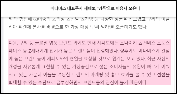 네이버 자회사인 네이버제트가 운영하는 '제페토'는 전 세계 2억 명의 회원을 보유하고 있고 대부분 10대와 해외 유저들입니다. 그 안에서 아바타를 통해 같이 대화도 하고, 아바타를 이용하여 드라마도 제작하는 등의 다양한 활동을 할 수 있습니다. 글로벌 명품 브랜드 포함 Z세대에게 인기가 높은 브랜드가 마케팅과 홍보를 위해 제페토에 입점해있다고 합니다.