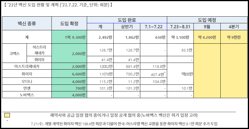 8월 말까지 약 3,100만 회분의 백신이 추가 공급될 예정으로, 백신별 세부적인 공급 일정은 제약사와 협의되는 대로 공개 가능한 범위에서 안내할 예정이라고 하네요. 백신 도입 현황 및 계획은 아래 표를 참고해주세요.