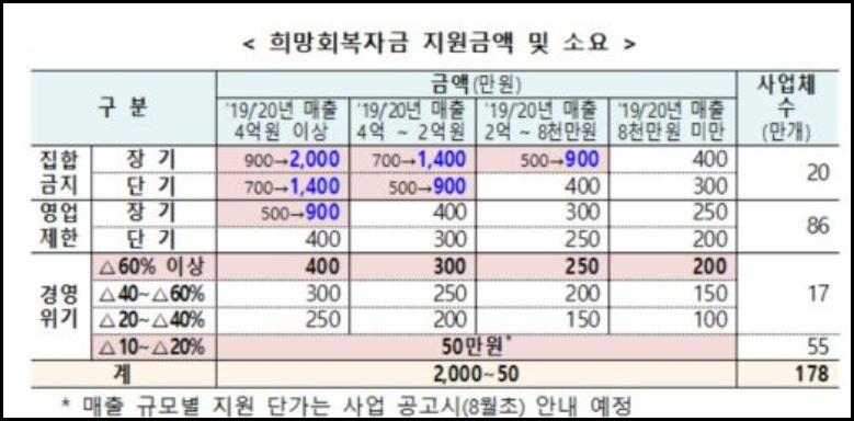 업종과 매출 규모, 기간에 따라 차등 지급. 최소 50만 원에서 최대 2천만 원 지급.