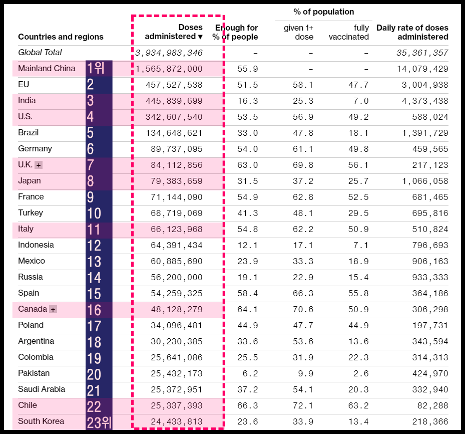 세계 코로나 백신 접종 현황과 순위는 bloomberg 홈페이지와 옥스포드 마틴스쿨 홈페이지 8월 19일 업데이트된 내용을 참고했습니다. 국내 백신별 접종률에 대한 정보는 코로나19 예방접종 대응 추