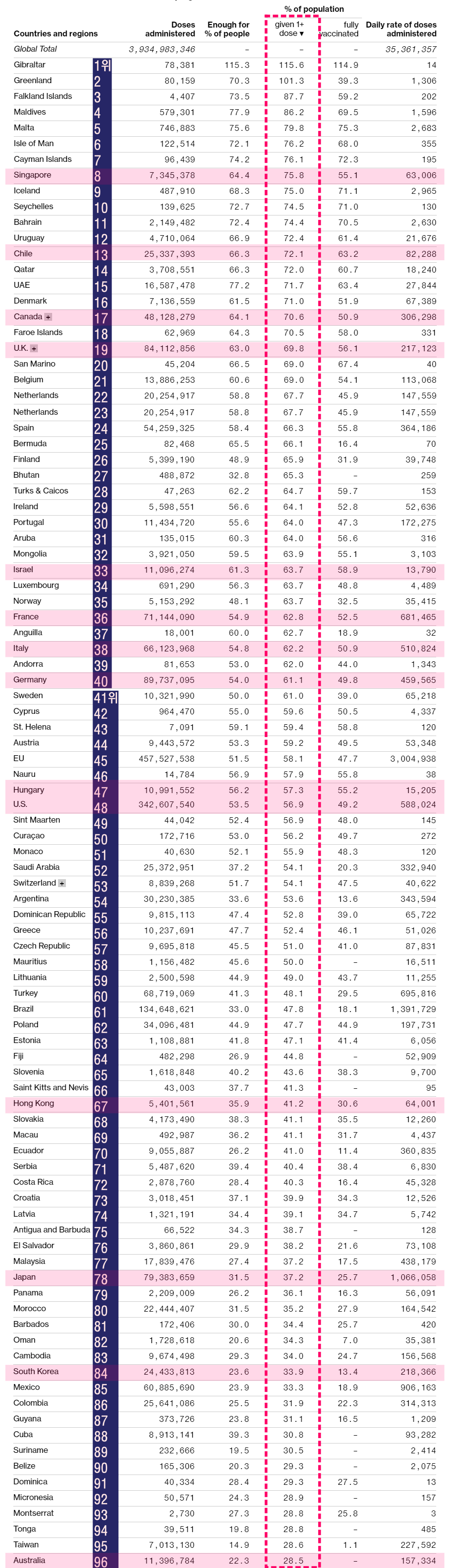 주요 국가들을 살펴보면 싱가포르 8위 (75.8%), 칠레 13위 (72.1%), 캐나다 17위 (70.6%), 영국 19위 (69.8%), 이스라엘 33위 (63.7%), 프랑스 36위 (62.8%), 이탈리아 38위 (62.2%), 독일 40위 (61.1%), 헝가리 47위 (57.3%), 미국 48위 (56.9%), 홍콩 67위 (41.2%), 일본 78위 (37.2%), 호주 96위 (28.5%), 인도 106위 (25.3%)입니다. 다른 국가별 1차 백신 접종현황은 아래 표에서 확인하세요.
