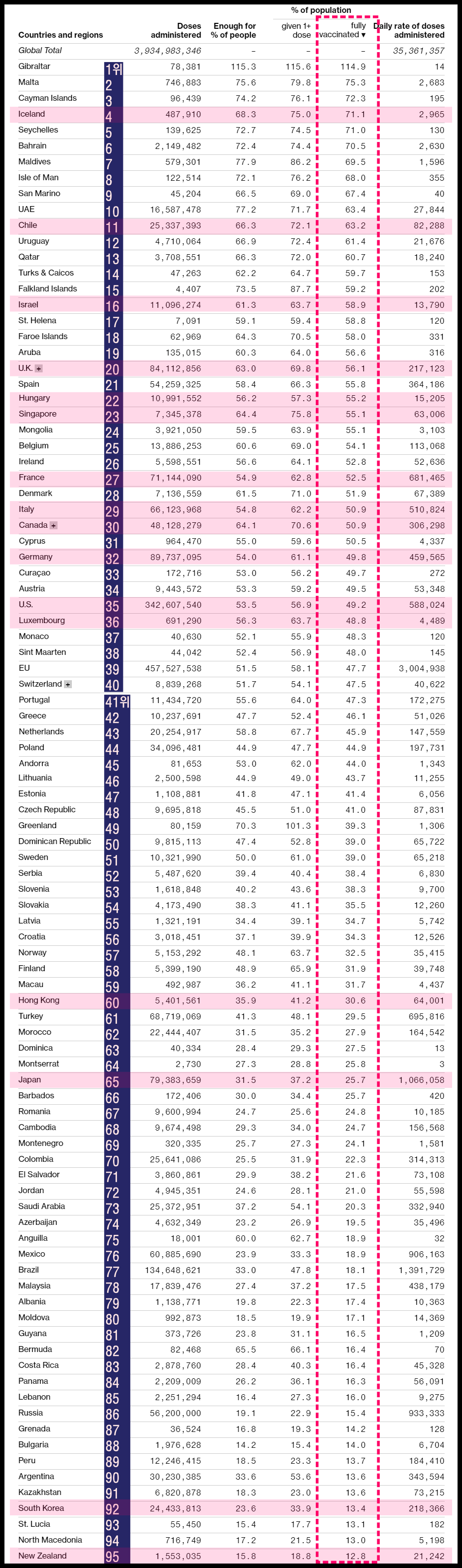 블룸버그에서 가져온 자료를 토대로 전 세계 백신 접종 순위(인구 대비 1회 이상 접종률)를 매겨보면 아래 그림과 같습니다. 한국은 1회 이상 접종률이 33.9%로 84위입니다. 블룸버그에서 우리나라 자료는 7월 26일 수치인 것 같습니다.