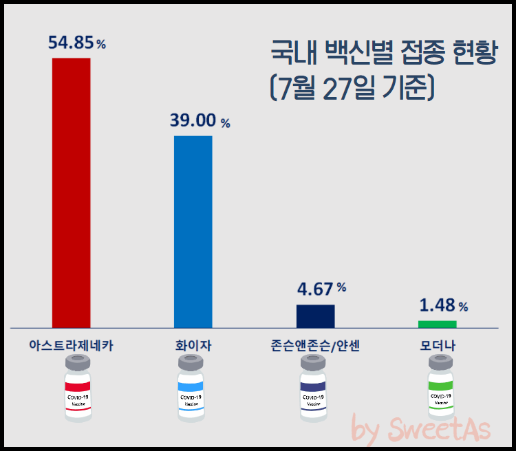 백신별 접종현황 그래프는 7월 27일 기준 국내 백신별 누적 접종 횟수를 코로나 백신 총 누적 접종 횟수로 나누어 계산한 자료입니다. 백신 별 접종률로는 아스트라제네카가 54.85%로 가장 많이 접종되었고, 그다음으로 화이자가 39%이고, 얀센은 4.67%, 모더나가 1.48%입니다. 모더나 백신 접종 주의사항에 대한 내용은 아래 포스팅에서 확인하세요.