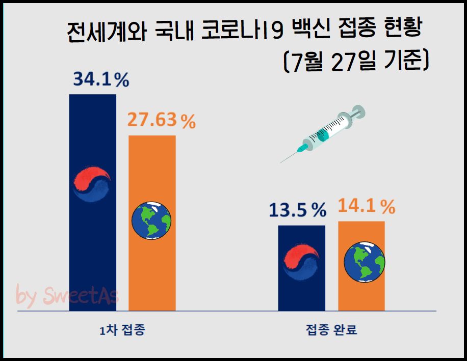 우리나라는 7월 27일 0시 기준으로 1차 접종은 총 17,516,422명으로 인구 대비 34.1%가 1차 접종을 받았고, 6,917,391명이 접종을 완료하여 인구 대비 13.5%가 접종을 완료하였습니다.