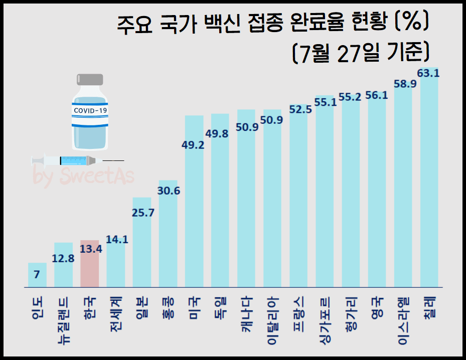 (8월 19일) 전 세계 백신 접종 현황 및 순위 | OECD 국가별, 백신별 백신 접종률