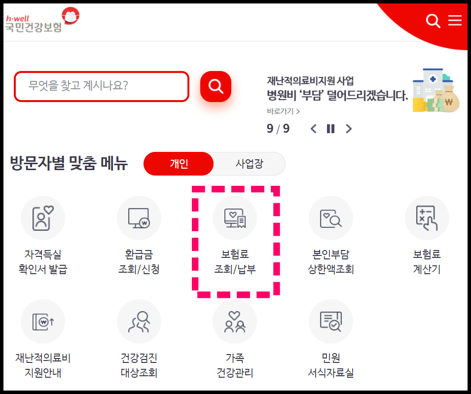 1. 국민건강보험 홈페이지 메인 화면에서 '보험료 조회/납부'를 선택합니다.