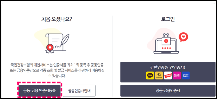 2. 처음 이용하시는 분들은 공동 인증서를 등록하는 절차가 필요하고, 그 후부터는 등록해둔 인증서로 바로 로그인할 수 있습니다. 회원가입 없이 인증서로 바로 로그인이 가능합니다.