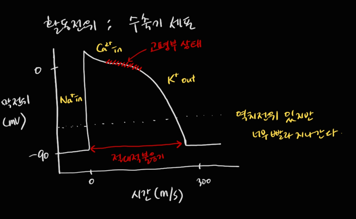 | 재분극 | 전압 의존성 K+채널 | 고평부 상태 Ca+ 추가 유입 K+ 유출 지연 |