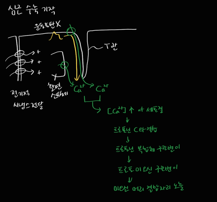 - 체성신경계 운동뉴런과 운동종판(근종판)에서 시냅스 전달이 일어난다. 활동전위가 근소포체에서 칼슘이온을 유출시키고 이때 근소포체의 칼슘 유출은 리아노다인수용체와 디히드로피리딘수용체라는 특수한 단백질의 상호작용(구조변이)에 의해 칼슘이온이 유출된다.