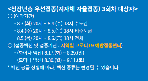 각 시도는 지역의 특성과 방역상황을 고려해 청장년층 가운데 자율적으로 우선접종 대상자를 선정하고, 사전예약을 8월 3일부터 6일까지 진행한다고 합니다.