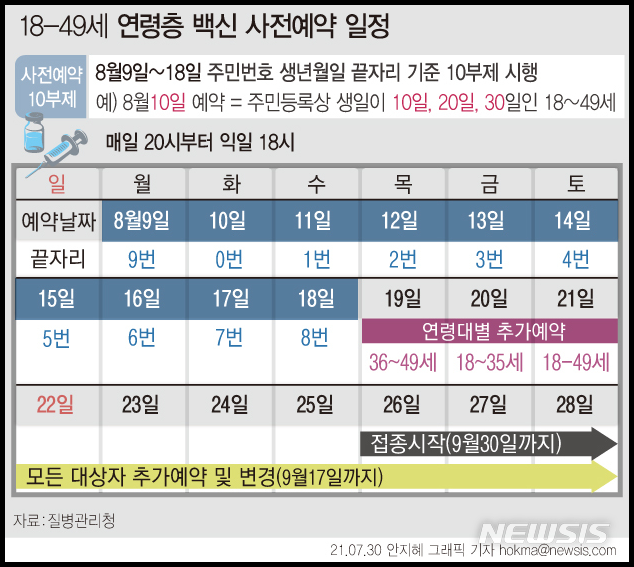 청장년층 우선접종 대상자, 18~49세 10부제 사전예약 일정
