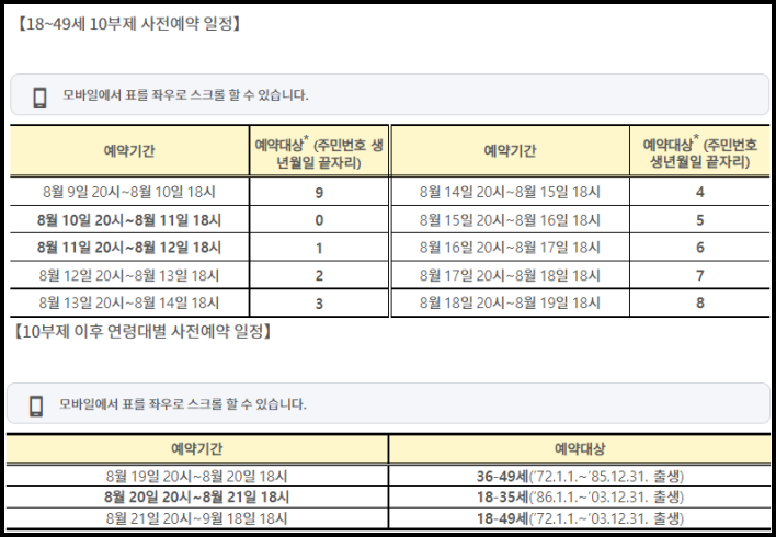 사전예약 10부제에 예약을 못한 대상자는 8월 19일부터 21일까지 추가 예약을 할 수 있습니다. 연령별로 추가예약 날짜는 다릅니다.