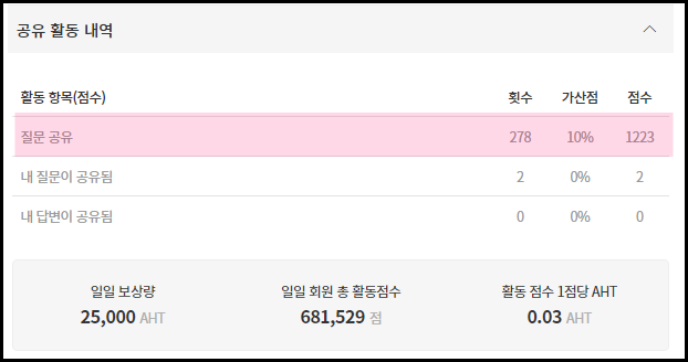 여하튼 전 출석체크 말고도 아하 지식인의 질문을 공유해서 추가적으로 아하 토큰을 모으고 있습니다. 아하 지식인의 어떤 질문이던지 카톡이나 블로그, SNS을 통해 공유해서 그 링크로 사람들이 유입이 되면, 유입된 인원 대비해서 활동 점수가 주어지고 그걸 매일 아하 토큰으로 환산해줘요.