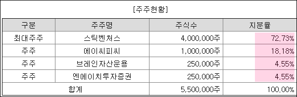 최대 주주인 스틱벤처스는 1999년 설립된 스틱인베스트먼트로부터 벤처투자 부문을 분할하여 2018년 7월에 설립된 기업이라고 하는데요. 분할 후 스팩 발기인으로는 처음 참여한다고 합니다. 스팩 파트너로는 처음이지만, 450여개 이상의 기업에 투자를 했고요. 곧 상장예정인 차백신연구소에 투자하고 있는 기업이기도 합니다.