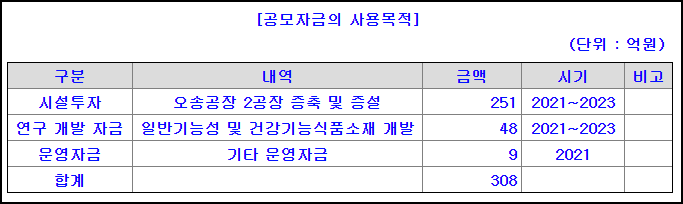 에스앤디의 건강기능식품 매출은 약 10% 정도이지만, 건강기능식품에서는 감태 및 미감주정추출물을 개발하여 국내 최초로 수면 개선 건강기능식품 개별인정 획득하고 상용화에 성공했다고 하네요. 이번 공모로 모은 자금은 건강기능식품 소재 비중을 확장하기 위한 공장 증축에 많은 비중이 사용될 것이라고 합니다.
