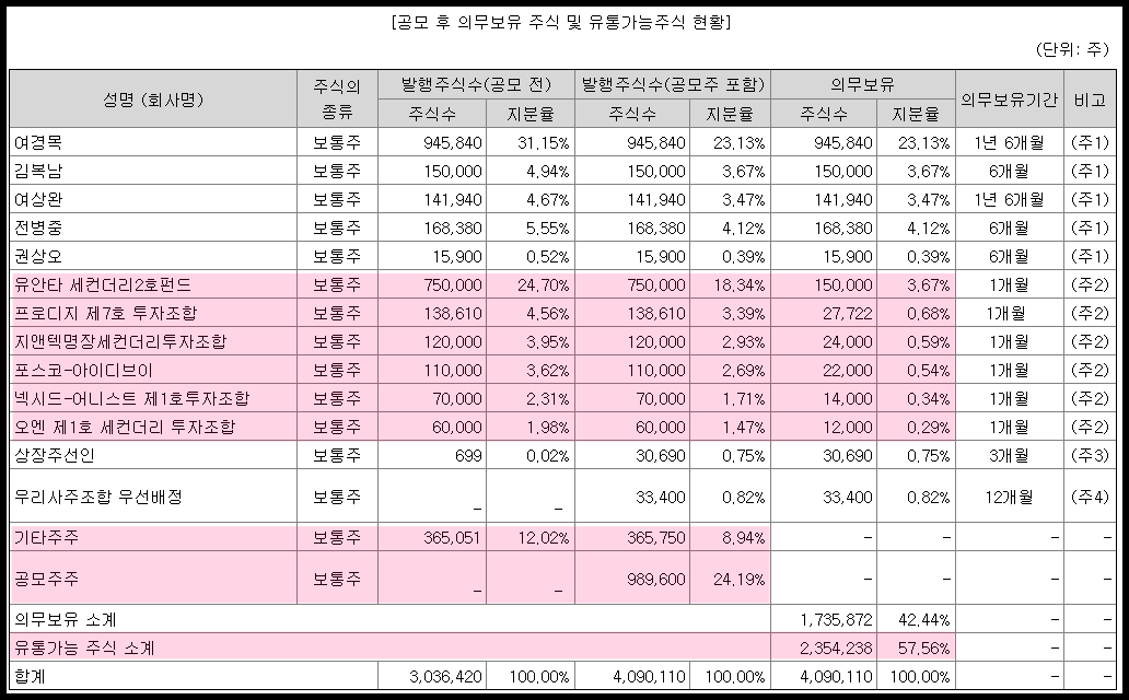 상장 이후 유통 가능한 주식수를 살펴봤는데요. 공모주주 외에 기존 주주의 물량도 꽤 풀리네요. 유통가능 주식수는 약 235만 주로 총주식의 57.56%으로 높은 편이네요. 이 점은 아쉽네요.