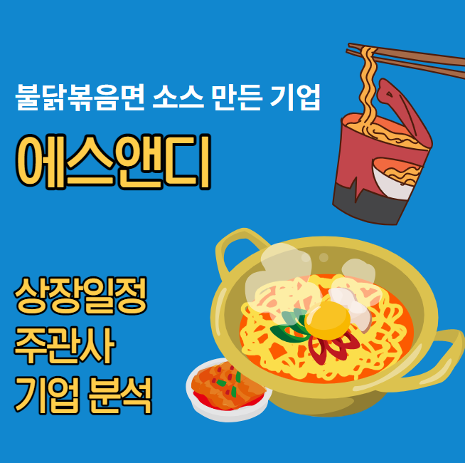 삼양라면스프와 불닭볶음면 소스를 만드는 기업이 상장을 한다고 합니다. 에스앤디라는 조미식품과 건강기능식품을 개발하고 만드는 기업인데요. 현재 코넥스에 상장되어 있고 코스닥으로 이전 상장을 합니다. 오늘 에스앤디 상장 일정, 주관사, 청약 수량 및 수수료에 대해 알아보겠습니다.