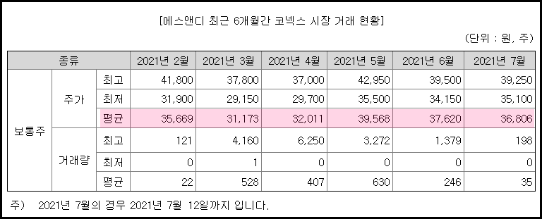에스앤디는 코넥스에 상장되어 있는데요. 최근 6개월간 평균 주가 범위는 약 31,000원 - 39,000원 정도 되네요.