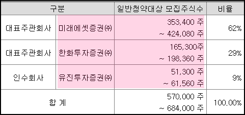 | 미래에셋증권 | 우대그룹 : 35,000 - 42,000주 일반그룹 : 17,500 - 21,000주 |