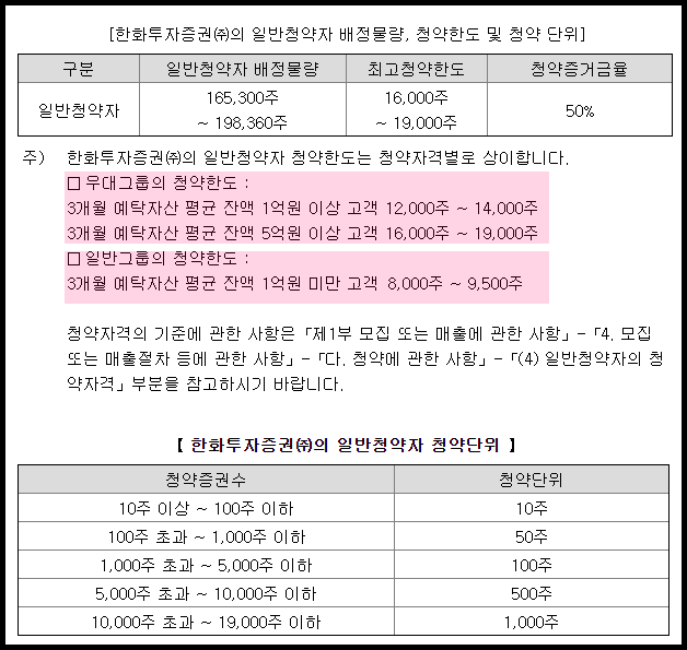 일반 청약자 배정물량은 570,000 - 684,000주이고요. 미래에셋이 35만 3400주로 가장 많이 배정됐고, 한화와 유진투자증권이 각각 16만 5300주와 5만 1300주를 배정받았네요.
