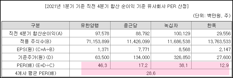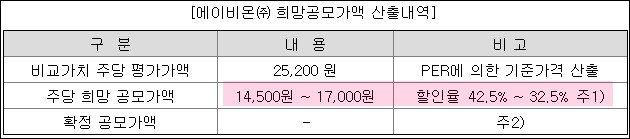 비교기업으로 유한양행, 종근당, 녹십자, 한독 총 4곳을 최종 선정하였네요. 이 기업들의 2021년 1분기 기준 직전 4분기 합산 순이익을 기준으로 PER를 계산하여 나온 평균 PER 28.6배를 적용하여 에이비온의 주당 평가가액을 25,200원으로 산출했습니다. 여기에 할인율 42.5% - 32.5%를 적용하여 희망 공모가액을 14,500원 - 17,000원으로 산정했습니다.